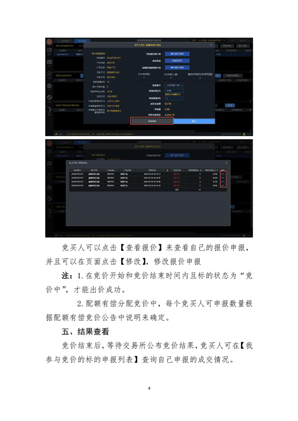 競(jìng)買(mǎi)人在競(jìng)價(jià)時(shí)間內(nèi)可進(jìn)行多次申報(bào),總申報(bào)量為各次申報(bào)的總量,總申報(bào)量不得超過(guò)競(jìng)買(mǎi)人允許的最大申報(bào)數(shù)量。競(jìng)價(jià)申報(bào)單允許向上修改報(bào)價(jià)和數(shù)量,不允許撤銷(xiāo)、向下修改報(bào)價(jià)或數(shù)量。