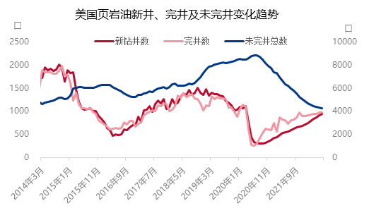 美國(guó)原油產(chǎn)出以頁(yè)巖油為主體,回顧近兩年,2020年5月是轉(zhuǎn)折點(diǎn),國(guó)際原油價(jià)格自此開始進(jìn)入低位反彈階段,從上圖也可以看出,美國(guó)頁(yè)巖油完井?dāng)?shù)也也是從這一時(shí)刻開始探底回升,但回升速度卻較為緩慢,同時(shí)新鉆井?dāng)?shù)量的增長(zhǎng)同樣不及預(yù)期。而另一方面,未完井總數(shù)卻出現(xiàn)了大幅滑坡,可以看出近兩年來(lái)美國(guó)頁(yè)巖油完井?dāng)?shù)的增長(zhǎng),主要以消耗此前積累的未完井為主。