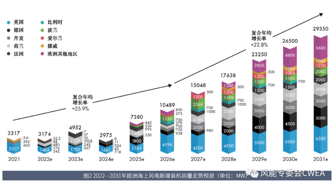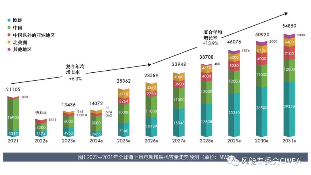 全球風(fēng)能理事會(huì)預(yù)測,歐洲將在2022-2031 年保持兩位數(shù)的增長,這是由于:固定式海上風(fēng)電已經(jīng)成為繼陸上風(fēng)電和太陽能光伏后,最具競爭力的發(fā)電技術(shù);漂浮式海上風(fēng)電商業(yè)化不斷取得進(jìn)展,將釋放深水海域風(fēng)能資源開發(fā)潛力;歐盟委員會(huì)在2020年11 月提出了海上可再生能源戰(zhàn)略,作為歐盟綠色協(xié)議的一部分,設(shè)定了到2050 年海上風(fēng)電累計(jì)裝機(jī)容量達(dá)到300GW 的目標(biāo),這使海上風(fēng)電發(fā)展成為實(shí)現(xiàn)2050 年凈零目標(biāo)的關(guān)鍵;歐洲發(fā)展“Power to X”的雄心,為海上風(fēng)電市場提供了進(jìn)一步增長的機(jī)會(huì)。