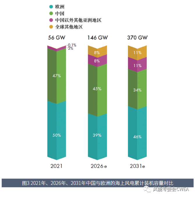 海上風(fēng)電在全球風(fēng)電新增裝機(jī)容量的占比, 將由2021 年的23% 提高到2031 年的32%。
