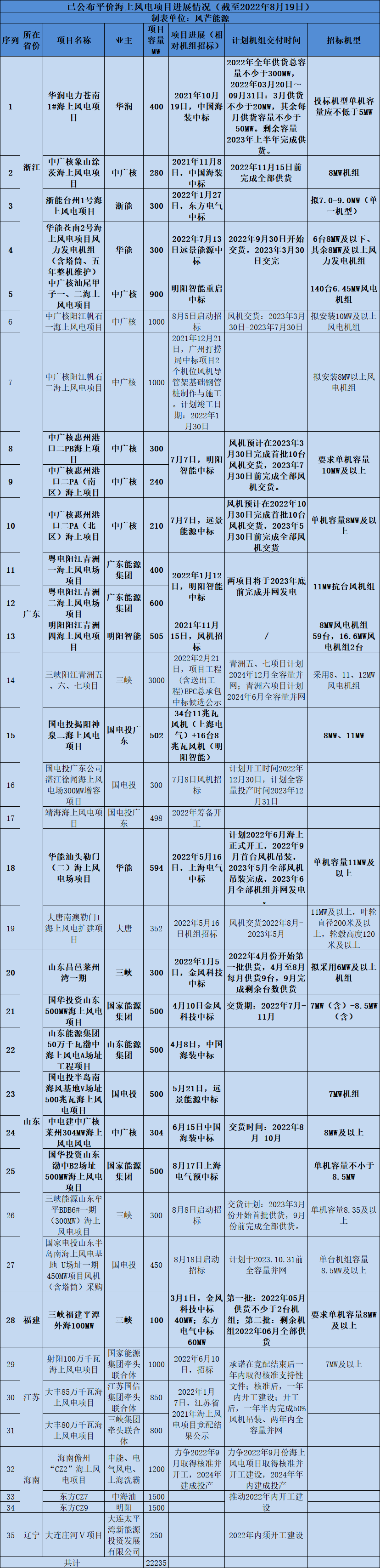 風(fēng)芒能源根據(jù)公開信息不完全統(tǒng)計(jì),截至目前,已有22.235GW平價(jià)海上風(fēng)電穩(wěn)步推進(jìn)中。其中,11.337GW已啟動(dòng)招標(biāo),8.235GW已完成整機(jī)中標(biāo)。中標(biāo)項(xiàng)目大部分要求今年9-10月開始交貨或交貨完成。