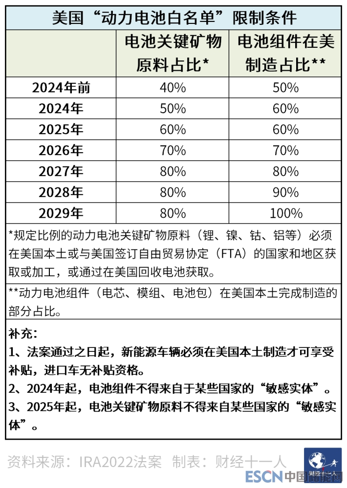 美國“動力電池白名單”的限制條款設(shè)定更為復(fù)雜,主要從電池關(guān)鍵礦物原料來源地和電池關(guān)鍵部件制造地兩方面進行限制。