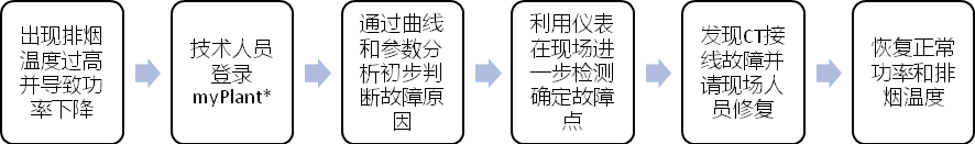 圖3 運(yùn)用myPlant* 解決某用戶(hù)沼氣發(fā)電機(jī)組排煙溫度高且功率顯示異常問(wèn)題過(guò)程示意圖