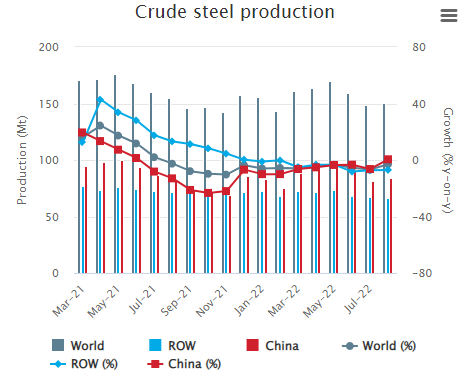 世界鋼鐵協(xié)會發(fā)布的初步數(shù)據(jù)顯示,2022年8月份,全球64個納入世界鋼鐵協(xié)會統(tǒng)計國家的粗鋼產(chǎn)量為1.51億噸,同比下降3.0%。