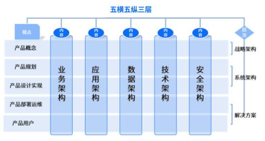 五縱,即縱向包括的五大架構(gòu)設(shè)計(jì)——業(yè)務(wù)架構(gòu)、應(yīng)用架構(gòu)、數(shù)據(jù)架構(gòu)、技術(shù)架構(gòu)、安全架構(gòu)。