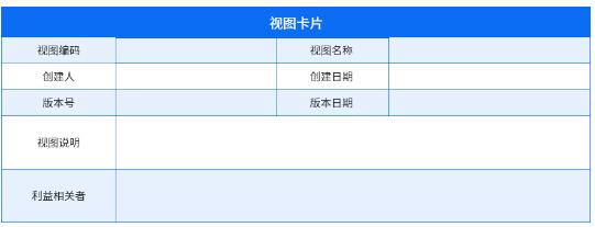 視圖卡片是關(guān)于視圖元信息的描述,通過(guò)視圖卡片可以了解視圖編碼、名稱、版本號(hào)、創(chuàng)建人、視圖描述和視圖的利益相關(guān)者。