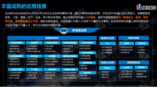 遠光軟件基于YG-RPA云平臺已經(jīng)成功打造出數(shù)百款RPA機器人,應(yīng)用場景覆蓋到財務(wù)、工程、營銷、生產(chǎn)、運監(jiān)、審計等業(yè)務(wù)領(lǐng)域,涉及行業(yè)囊括電力、能源化工、航空、醫(yī)療等,服務(wù)單位遍布全國各省市超過上千家,為企業(yè)節(jié)省了大量人力,推動企業(yè)管理變革和業(yè)務(wù)創(chuàng)新。