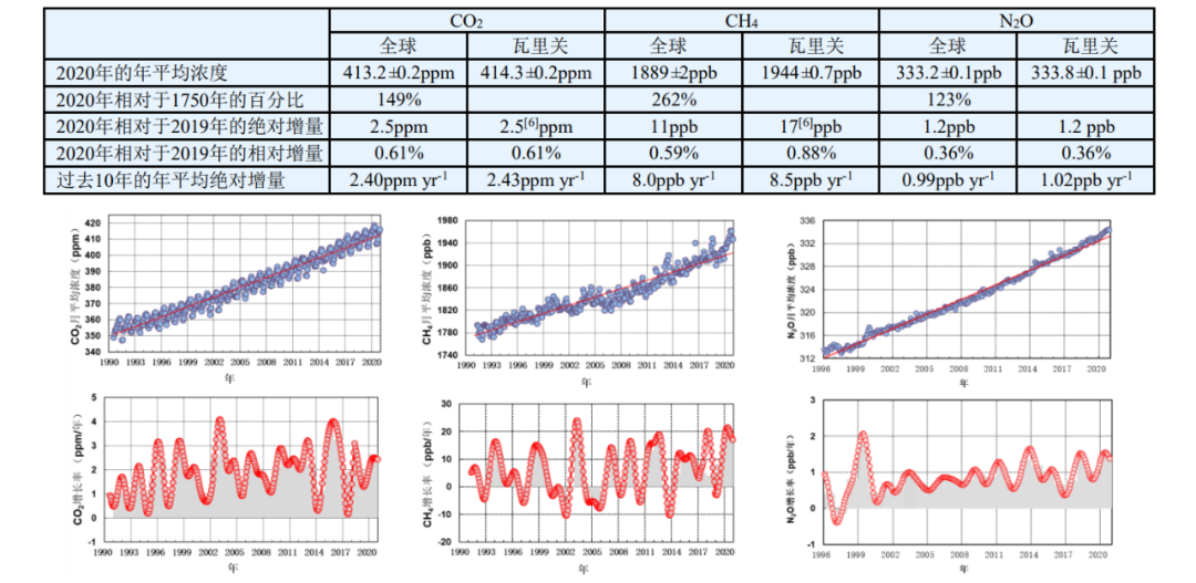 1990 年以來瓦里關站大氣 CO2、CH4、N2O 濃度(上圖)及其增長率(下圖) 上圖中的藍點表示月平均值,紅線為其線性擬合曲線;下圖中的紅點表示月增長率,灰色柱為增長率年平均二氧化碳
