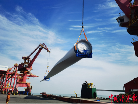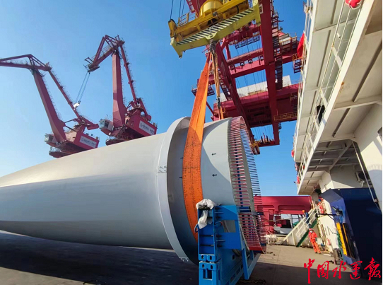 日前,“振新66”輪完成海上風電葉片裝船作業(yè)后離泊,山東港口東營港順利完成今年第8套風電葉片的裝船發(fā)運。