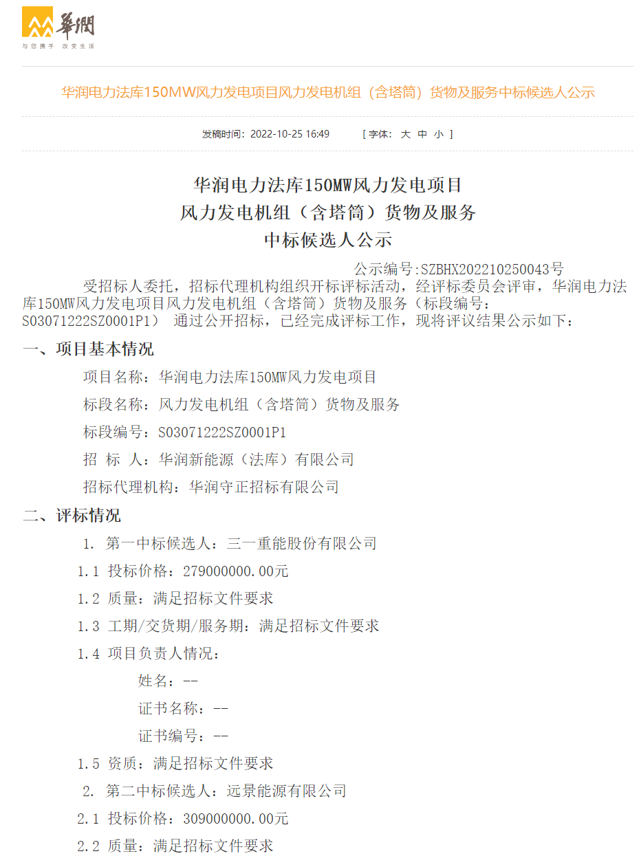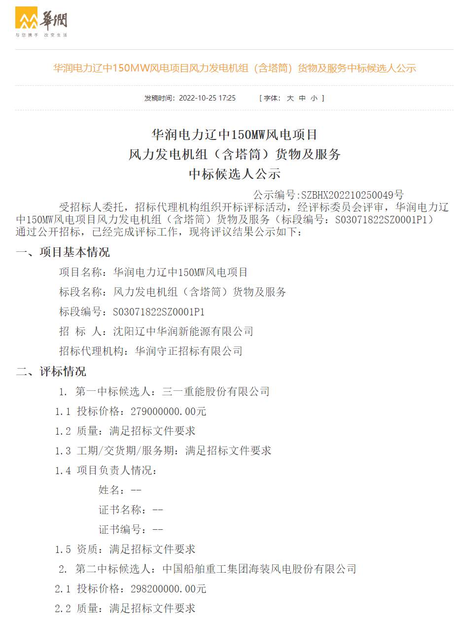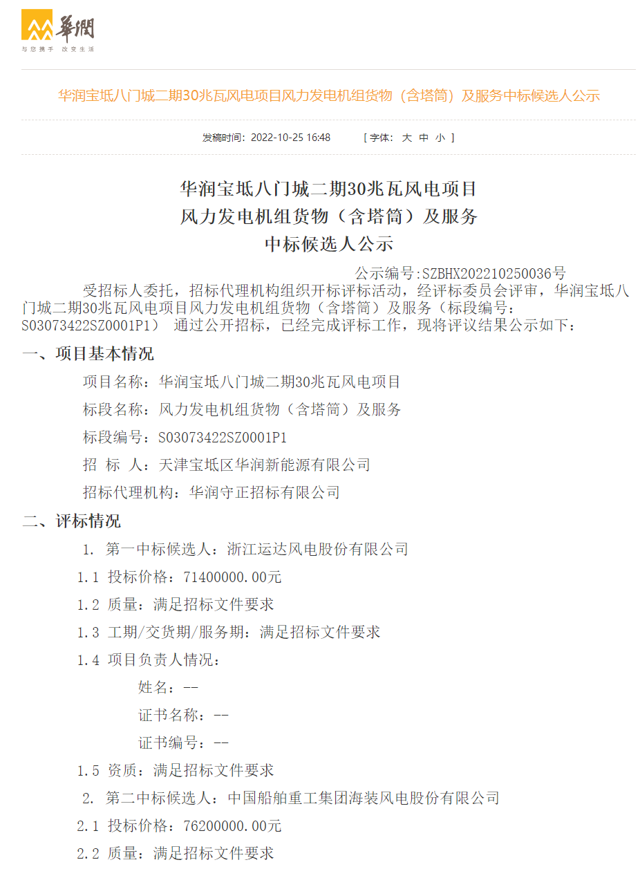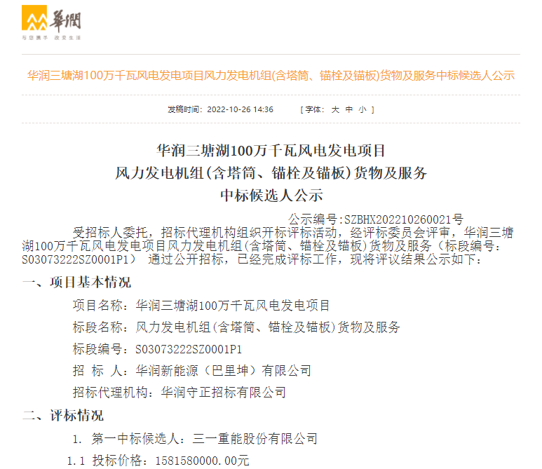 10月25日,華潤電力發(fā)布華潤三塘湖100萬千瓦風(fēng)電發(fā)電項目、遼中150MW風(fēng)電項目、法庫150MW風(fēng)電項目、寶坻八門城二期30兆瓦風(fēng)電項目風(fēng)力發(fā)電機組(含塔筒)貨物及服務(wù)中標(biāo)候選人公示,規(guī)模共計1330MW,其中:三一重能預(yù)中標(biāo)1300MW,運達(dá)股份預(yù)中標(biāo)30MW。