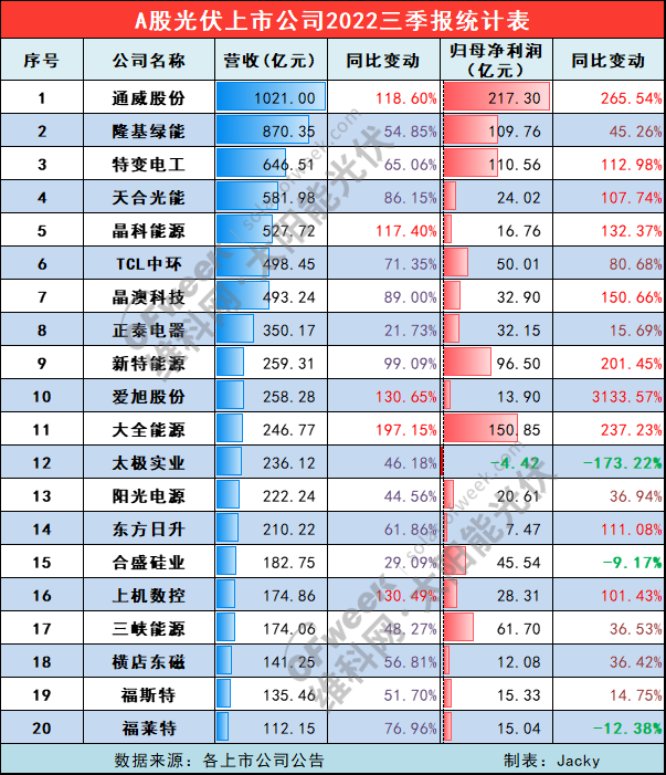 光伏上市公司2022年三季報業(yè)績統(tǒng)計表(圖源:維科網(wǎng)光伏)