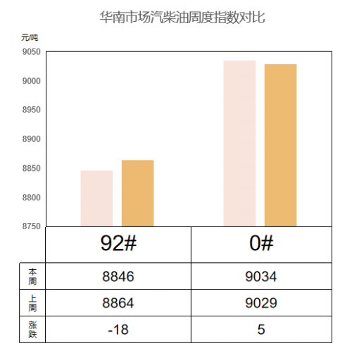 華南主營(yíng)汽跌柴穩(wěn)。近期主營(yíng)單位多挺價(jià),價(jià)格穩(wěn)中小幅下降;柴油現(xiàn)貨依舊偏緊,主營(yíng)單位控量銷售,保供終端及加油站為主。