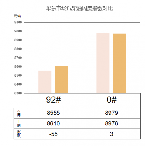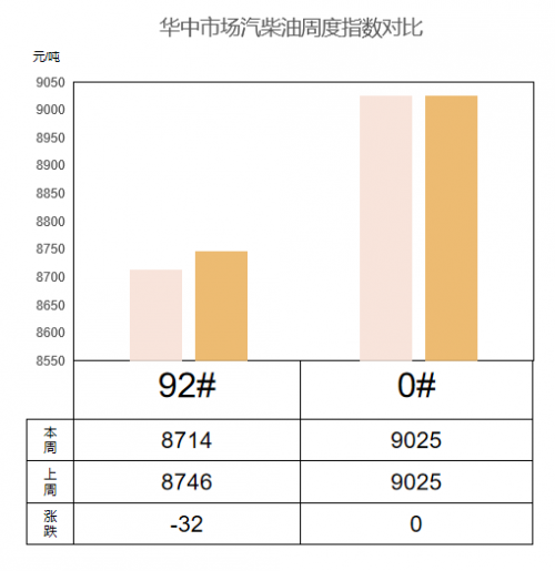 華中(湖南、湖北、江西、安徽) 成品油價(jià)格汽跌柴穩(wěn)。本周92#汽油市場(chǎng)價(jià)格為8714元/噸,較上周下跌32元/噸,跌幅0.37%;0#柴油市場(chǎng)價(jià)格為9025元/噸,較上周上漲167元/噸,漲幅1.89%。目前來看,油價(jià)底部支撐得到持續(xù)加固,短期內(nèi)大跌風(fēng)險(xiǎn)明顯減弱,或仍將在相對(duì)高位區(qū)間運(yùn)行。