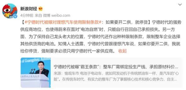 如果理想選擇其他企業(yè)作為第二供應(yīng)商,寧德時代就停止對其供貨,從而要求車企只能使用寧德時代的產(chǎn)品。