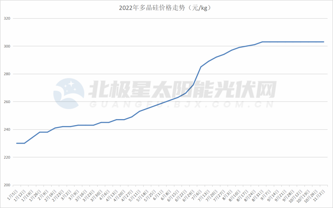 據(jù)北極星太陽能光伏網(wǎng)跟蹤PVInfoLink報(bào)價(jià),經(jīng)過2021年末短暫下調(diào)后,今年年初至8月底上游硅料價(jià)格一路“飛馳”,多晶硅料價(jià)格由230元/kg上漲至303元/kg,最高峰時(shí)曾攀至310元/kg,漲幅高達(dá)35%。