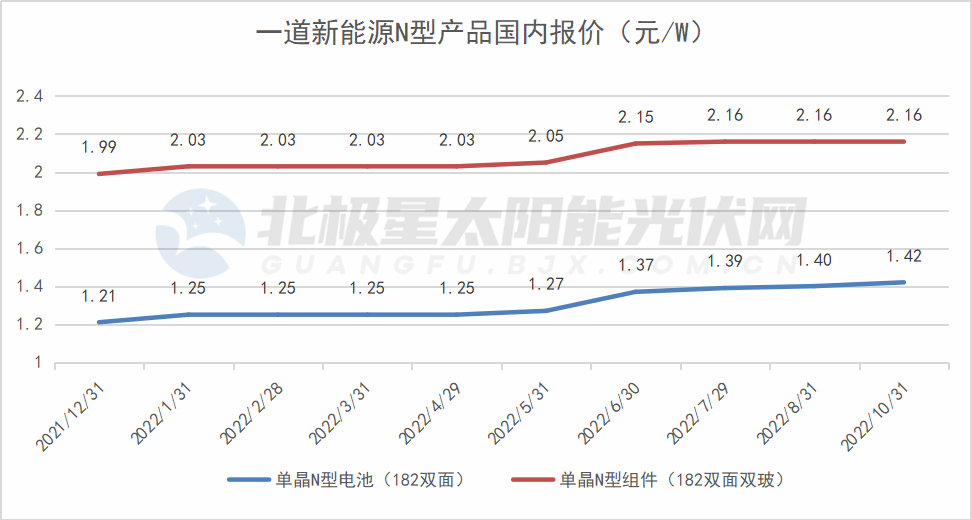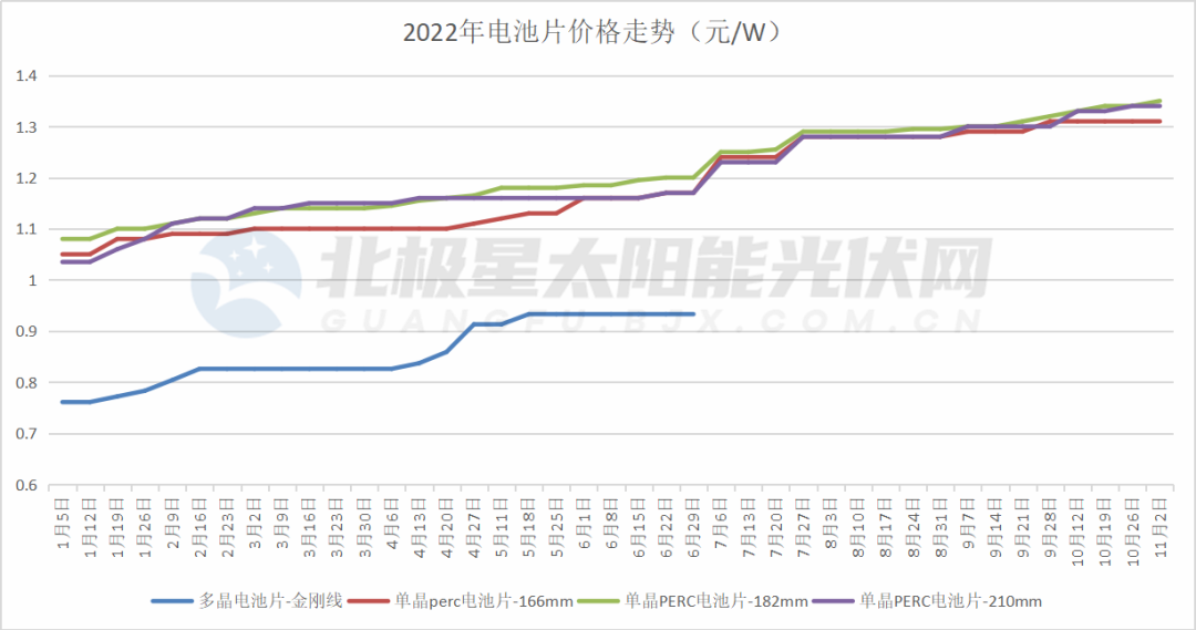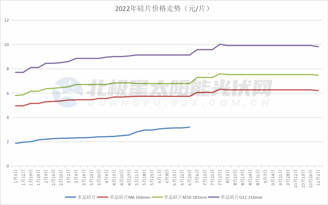 截至11月2日,電池片現(xiàn)貨價(jià)格依舊呈小幅上漲態(tài)勢(shì),M6均價(jià)漲至1.31元/W,漲幅24.8%;M10均價(jià)漲至1.35元/W,漲幅25%;G12均價(jià)漲至1.34元/W,漲幅29.5%。值得一提的是,10月25日,通威電池片最新報(bào)價(jià)雖未上調(diào),但厚度減薄,常規(guī)166電池片厚度保持160μm,182、210電池片厚度則由155μm降為150μm,距離上次厚度調(diào)整僅時(shí)隔4個(gè)月,電池片薄片化趨勢(shì)再次提速。
