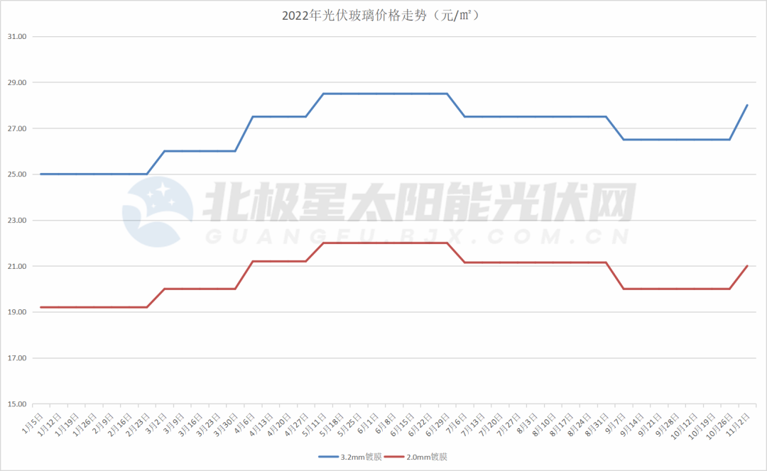 但近期光伏玻璃也在醞釀漲價(jià),玻璃企業(yè)唐山金信太陽能10月末發(fā)布的調(diào)價(jià)函就表示公司玻璃價(jià)格上漲2.5-3元/平方米。11月2日PVinfolink最新現(xiàn)貨價(jià)格也反映,光伏玻璃開始提價(jià),3.2mm玻璃均價(jià)28元/㎡,2mm玻璃均價(jià)21元/㎡。年初至今,光伏玻璃漲幅9.4%~12%,成為年初至今產(chǎn)業(yè)鏈價(jià)格漲幅最小的環(huán)節(jié)。