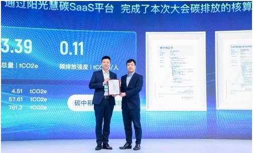 會議現(xiàn)場,陽光慧碳科技有限公司副總裁陳韋作為代表,為本次會議頒發(fā)了碳中和證書,科大訊飛云平臺業(yè)務(wù)群副總裁周傳福作為本次大會碳中和合作方代表出席領(lǐng)證。