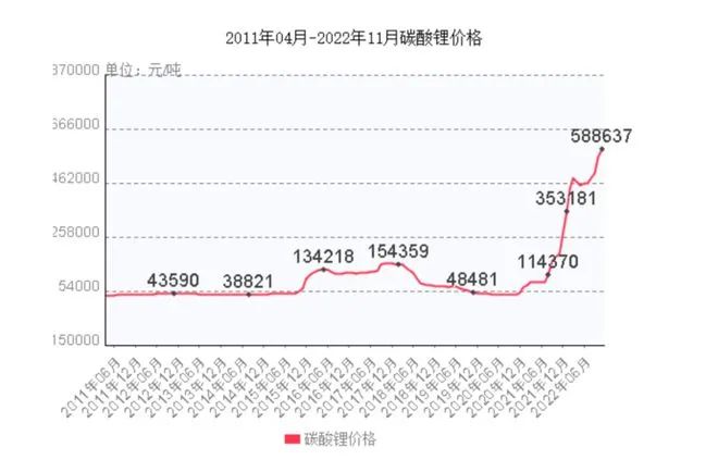 數(shù)據(jù)顯示,自11月電池級(jí)碳酸鋰價(jià)格行情正式突破60萬元/噸之后,截至目前持續(xù)高位盤整,相較去年年初,漲幅達(dá)到1057.7%,創(chuàng)下歷史新高記錄。對(duì)此,寧德時(shí)代等電芯大廠也曾多次喊話,碳酸鋰超過50萬元/噸,就無法承受,要采取反制措施。今年3月,寧德時(shí)代就被爆出減產(chǎn)的傳聞,當(dāng)時(shí)也正值碳酸鋰均價(jià)突破新高之際,但碳酸鋰的價(jià)格還是從年初的每噸27.8萬元上逼近到如今的60萬元關(guān)口。