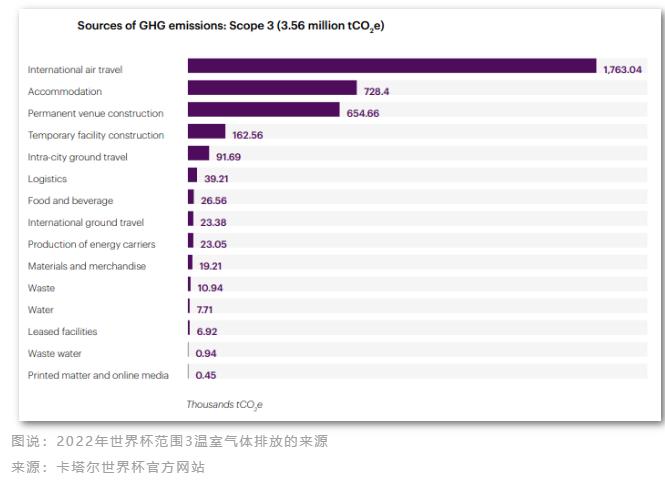 根據(jù)組委會還發(fā)布的2022世界杯溫室氣體排放報告,從2011年4月至2023年6月的籌備、賽事和賽后三個階段,本屆世界杯報告期溫室氣體排放總量估計為363萬噸二氧化碳當(dāng)量。其中大部分(98%)是間接排放(范圍3,356萬噸二氧化碳當(dāng)量),主要來自于卡塔爾的比賽參加者,包括普通公眾、官員和工作人員的旅行。