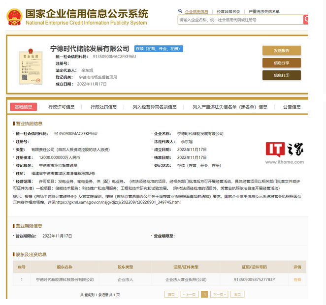 IT之家 11 月 21 日消息,據(jù)國(guó)家企業(yè)信用信息公示系統(tǒng),近日,寧德時(shí)代儲(chǔ)能發(fā)展有限公司成立,法定代表人為余東旭,注冊(cè)資本 1.2 億人民幣,股東信息顯示,該公司由寧德時(shí)代新能源科技股份有限公司全資持股。