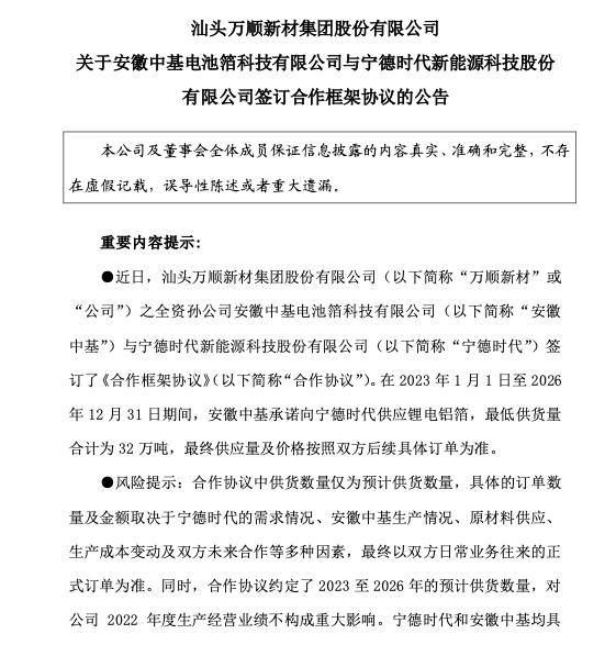 協(xié)議內(nèi)容為:在2023年1月1日至2026年12月31日期間,安徽中基承諾向?qū)幍聲r(shí)代供應(yīng)鋰電鋁箔,最低供貨量合計(jì)為32萬(wàn)噸,最終供應(yīng)量及價(jià)格按后續(xù)具體訂單為準(zhǔn)。