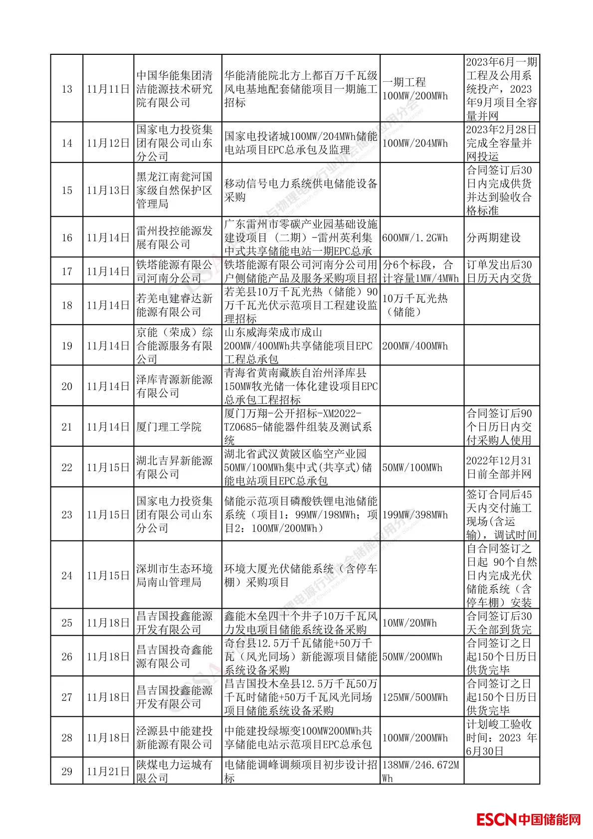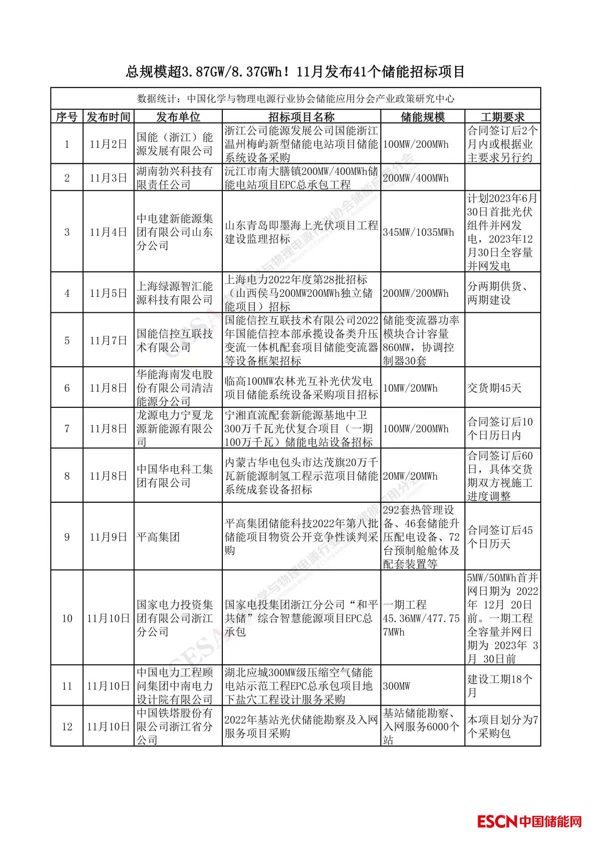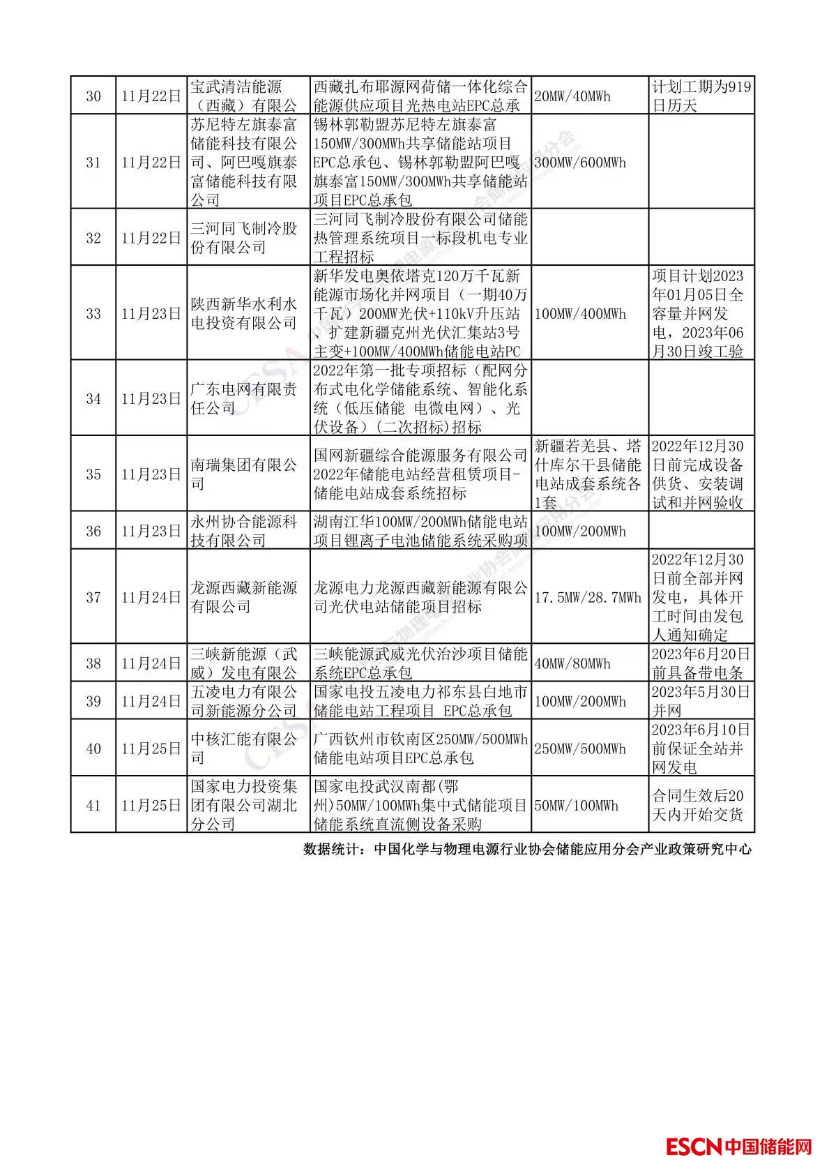 據中國儲能網不完全統(tǒng)計,11月發(fā)布41個儲能招標項目,其中百兆級項目22個,吉瓦級項目2個,產品采購及其他項目17個。招標內容包括EPC、儲能系統(tǒng)設備采購、工程設計、建設施工/監(jiān)理等,總規(guī)模超3.87GW/8.37GWh。