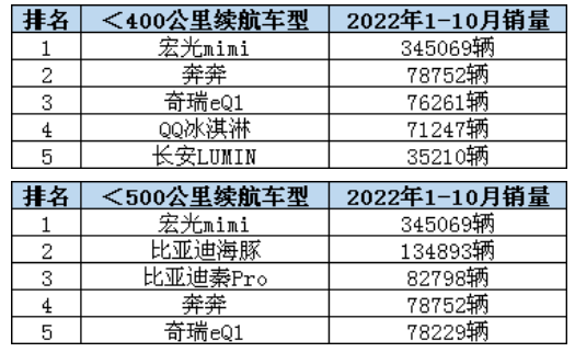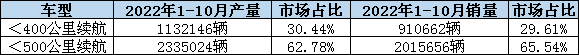 從國內(nèi)電動汽車產(chǎn)銷量看,動力電池應(yīng)用分會數(shù)據(jù)顯示,2022年1-10月國內(nèi)400公里以下續(xù)航車型產(chǎn)量占電動車市場的30.44%,500公里以下續(xù)航車型占62.78%;銷量占比也基本保持同頻,400公里和500公里以下續(xù)航車型銷量分別占29.61%和65.54%。