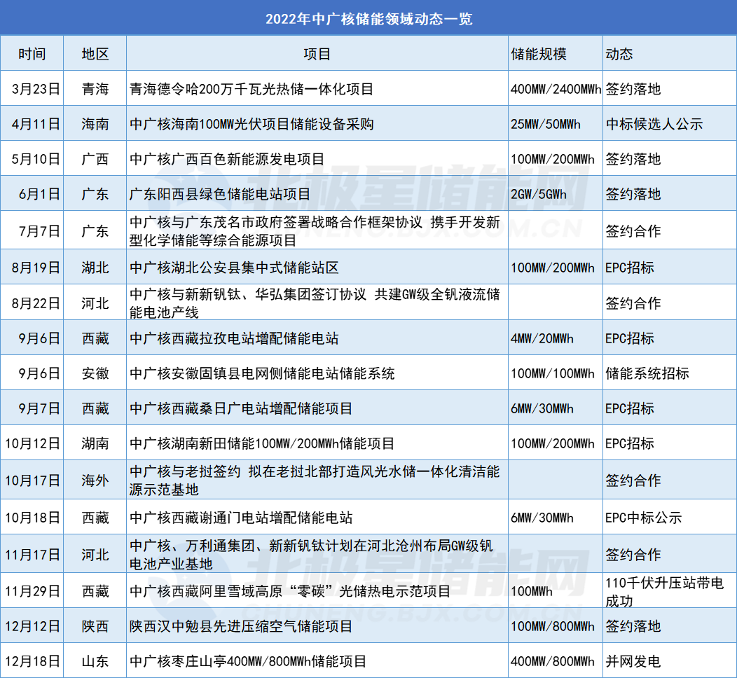 隨著儲能扶持政策出臺,除了風(fēng)電光伏之外,中廣核新能源近年來加速布局儲能賽道。2022年,中廣核簽約、立項一大批儲能項目,總規(guī)模達到3.34GW/10.03GWh。