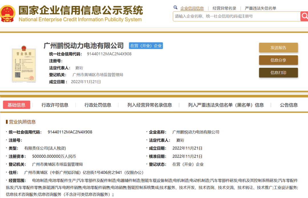 12 月 21 日消息,據(jù)國家企業(yè)信用信息公示系統(tǒng)顯示,近日,廣州鵬悅動力電池有限公司成立,法定代表人為小鵬汽車聯(lián)合創(chuàng)始人之一夏珩,注冊資本 50 億元人民幣,經(jīng)營范圍含電池制造和電池零配件生產(chǎn)等。