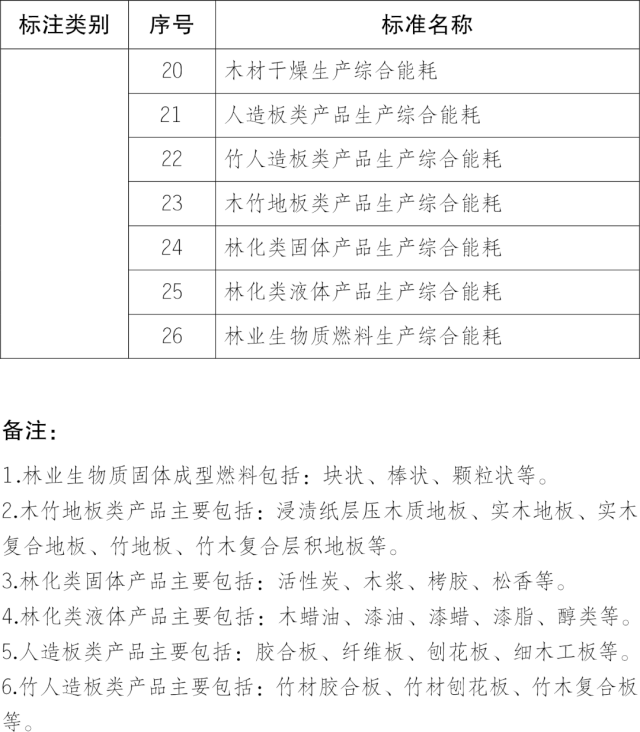 主要規(guī)定了木材生產(chǎn)及板材加工、木材干燥、人造板類、木竹地板類、林化類產(chǎn)品、林業(yè)生物質(zhì)燃料生產(chǎn)綜合能耗等標(biāo)準(zhǔn)。