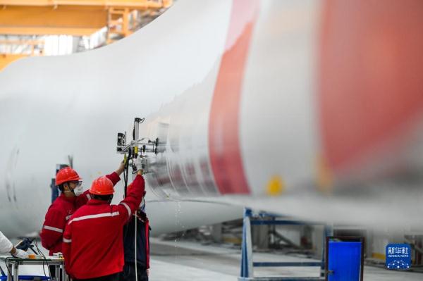 2月9日,在內(nèi)蒙古烏蘭察布市遠(yuǎn)景北方能源有限公司,質(zhì)檢員在風(fēng)機(jī)葉片生產(chǎn)線上工作。