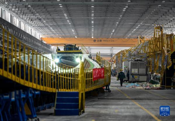 2月9日,在內(nèi)蒙古烏蘭察布市遠(yuǎn)景北方能源有限公司,工人在風(fēng)機(jī)葉片生產(chǎn)線上工作。
