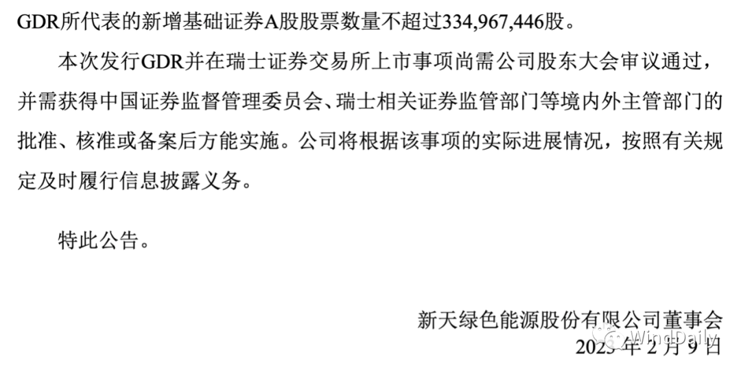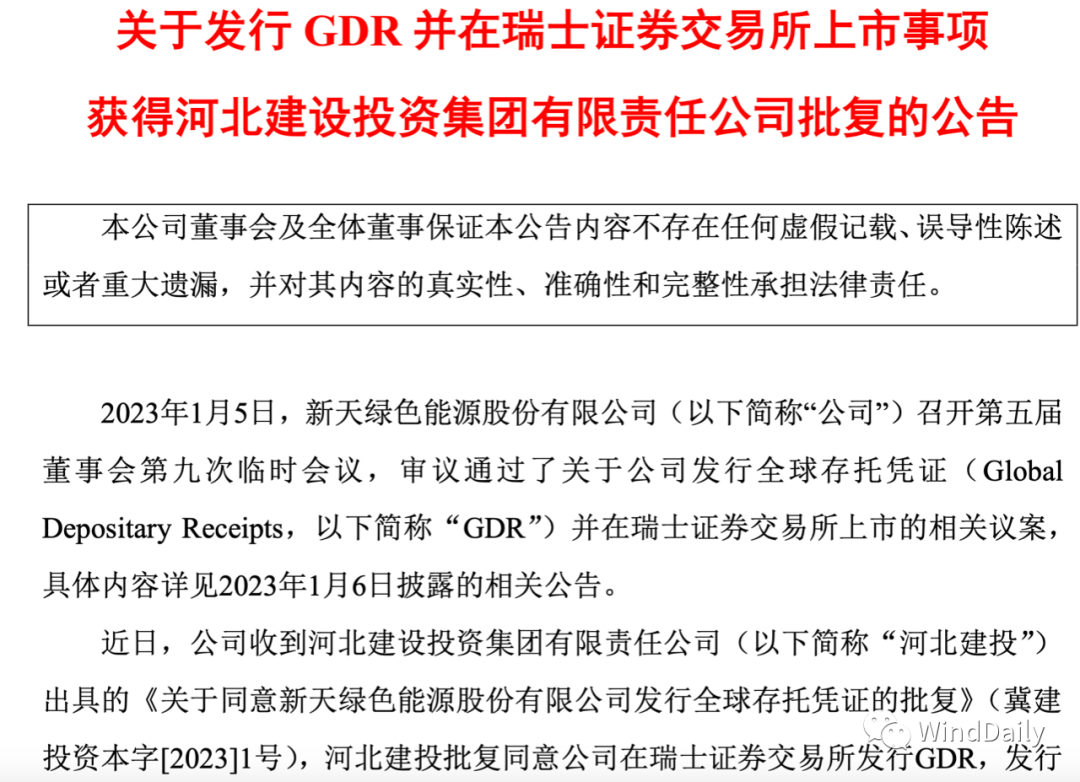 中國風(fēng)電整機商新天綠色能源董事會審議通過了關(guān)于公司發(fā)行全球存托憑證(簡稱“GDR”)并在瑞士證券交易所上市的相關(guān)議案。目前河北建投批復(fù)同意新天綠色能源在瑞士證券交易所發(fā)行GDR,發(fā)行 GDR所代表的新增基礎(chǔ)證券A股股票數(shù)量不超過334,967,446股。這是繼天順風(fēng)能之后又一個計劃在瑞士上市的風(fēng)電企業(yè)。具體如下: