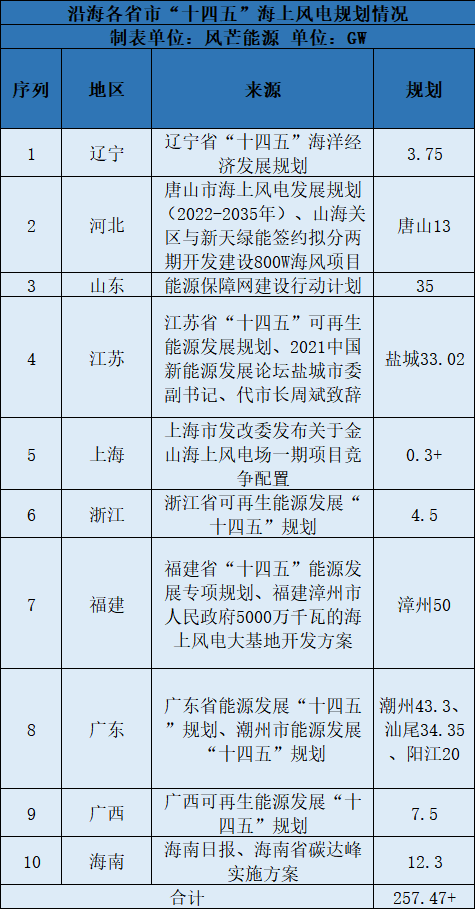 風(fēng)芒能源根據(jù)公開信息不完全統(tǒng)計,目前已出爐的沿海省市海上風(fēng)電規(guī)劃超250GW。
