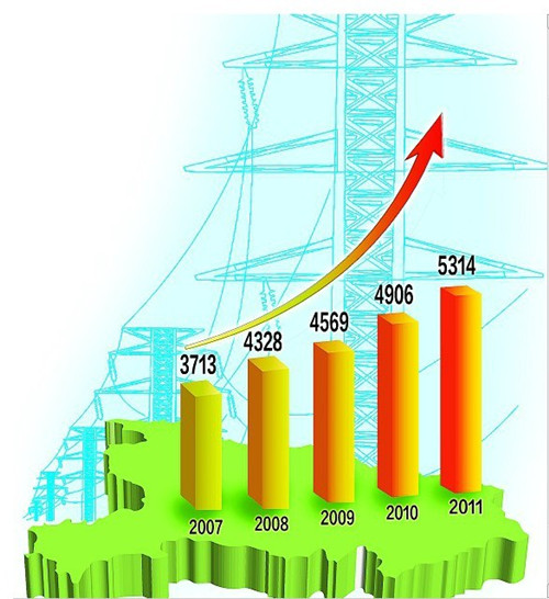 一次能源生產(chǎn)量,從2006年的3134.35萬噸標煤,增加到2011年的4719.90萬噸標煤;全省發(fā)電裝機總?cè)萘窟_5314萬千瓦,比2005年增長94%,位居全國第七。其中,水電總裝機3386.15萬千瓦,比2005年增長89.3%,規(guī)模位居全國第一;全省火電裝機達到1917萬千瓦,比2005年增長101%,新增裝機遠超同類省份。
