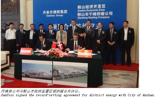 經(jīng)過一年籌劃,丹佛斯與其在鞍山的長期合作伙伴日前簽訂了一項具有里程碑意義的合作協(xié)議。根據(jù)協(xié)議,到2015年,丹佛斯將為鞍山市提供價值數(shù)億元人民幣的區(qū)域供熱解決方案。這是丹佛斯迄今為止在中國簽署的最大的區(qū)域能源項目商業(yè)協(xié)議。該項目的準(zhǔn)備和實施獲得了丹佛斯在中國的戰(zhàn)略合作伙伴COWI公司的大力支持。