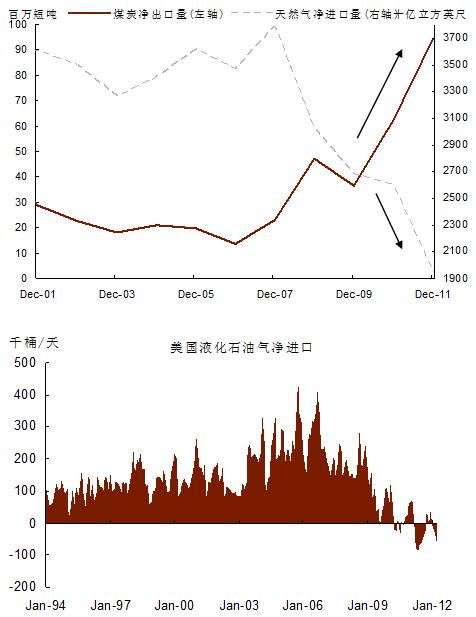 Williston盆地巴肯老油田是美國最主要的致密油產區(qū),其產量從2003年的1萬bbl/d提高到2010年的45.8萬bbl/d,這其中絕大多數的增量來自頁巖油的開采。頁巖油產量上升在美國帶來的最直觀的的影響就是美國天然氣進口大幅下降和煤炭出口的大幅上升;天然氣凝析液產量的快速上升,美國LPG市場于2011/12年實現凈出口。