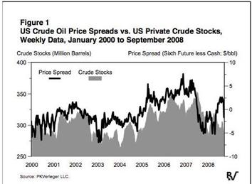 下圖顯示了2000年1月-2008年9月的WTI期貨與現(xiàn)貨價差和商業(yè)原油庫存增長變化。