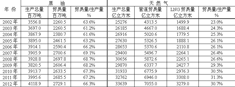 2002-2011年原油和天然氣國(guó)際貿(mào)易量