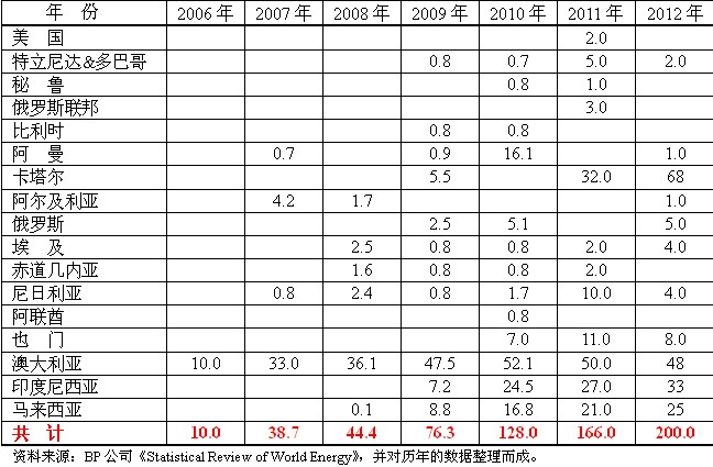 2012年世界液化天然氣貿(mào)易量為3279億立方米,中國大陸液化天然氣進(jìn)口量為200億立方米,占世界總量的6.1%;中國臺灣進(jìn)口量為169億立方米,也為世界總量的5.2%。