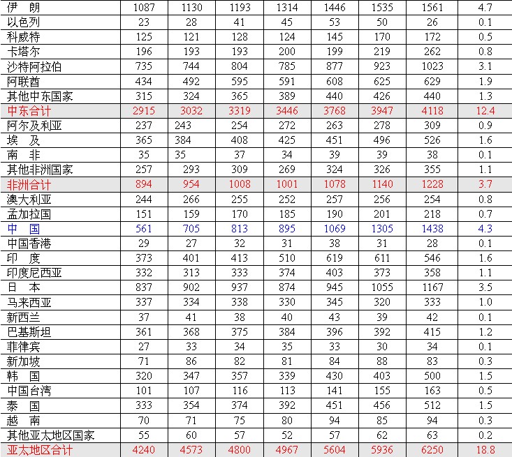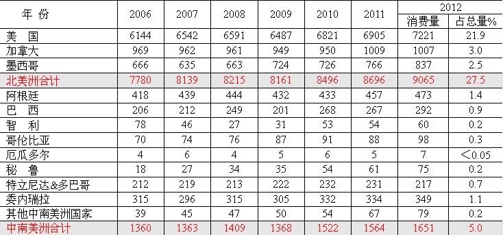 2006~2012年世界各國(guó)天然氣消費(fèi)量單位:億立方米/108m3