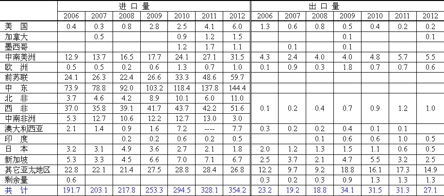 2006-2012年中國(guó)石油進(jìn)出口量及來(lái)源(單位:百萬(wàn)噸)