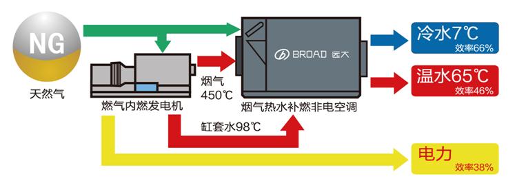 發(fā)電機向建筑送電,非電空調(diào)用煙氣熱水制冷制熱,不發(fā)電時用天然氣補燃。系統(tǒng)包含4臺內(nèi)燃機,4臺煙氣熱水補燃型非電空調(diào)設(shè)備,和3臺直燃型非電空調(diào)設(shè)備,發(fā)電量為4640kW,發(fā)電效率為39%,制冷量為4500*10^4kcal/h,每年節(jié)約的能源約為2400噸標煤,每年為節(jié)能減排事業(yè)貢獻7032噸的二氧化碳減排量。