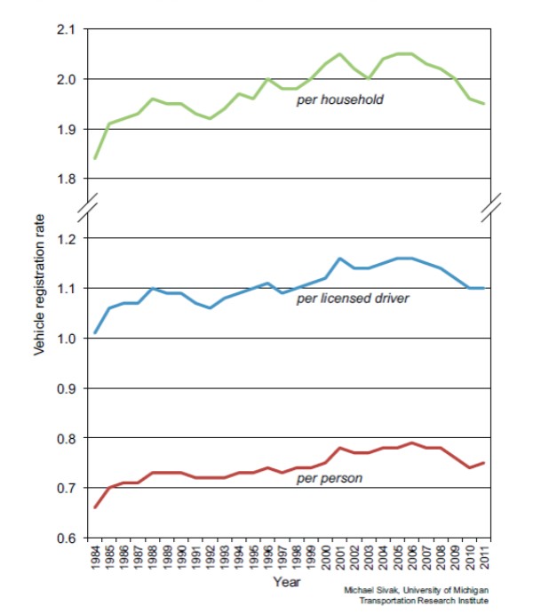 美國每個(gè)家庭、每個(gè)有牌照的駕駛員和每個(gè)人的登記輕型汽油車數(shù)量。數(shù)據(jù)來源:Sivak(2013)