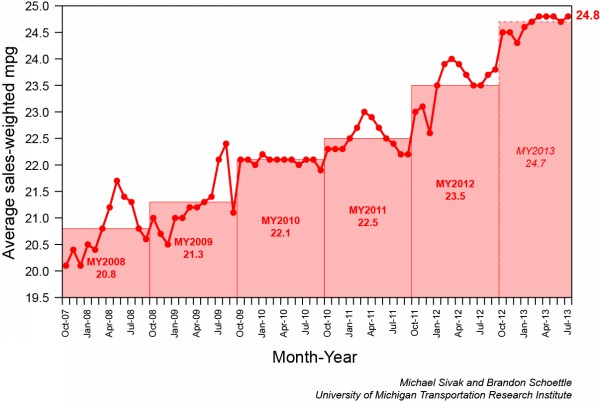 美國新出售輕型汽油車每加侖汽油平均的行駛里程。數(shù)據(jù)來源:UMTRI