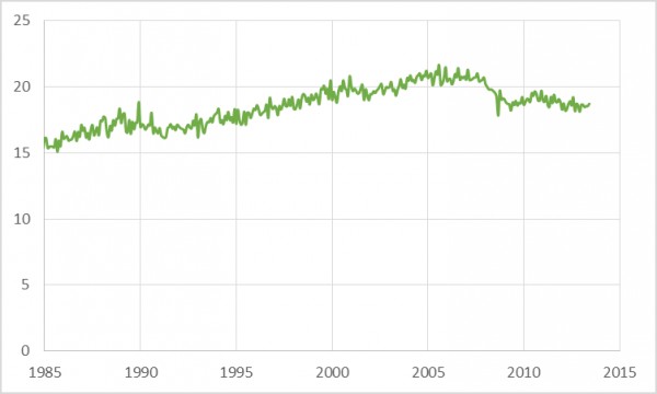 從1985年1月至2013年6月,美國原油和汽油產(chǎn)品的產(chǎn)品供應(yīng)量(百萬桶/天)。數(shù)據(jù)來源:美國能源信息署