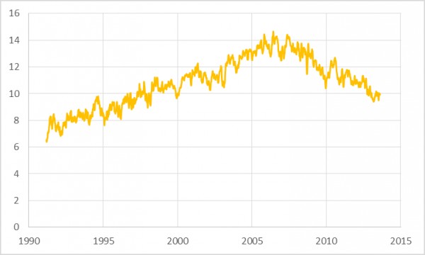 1991年3月8日至2013年8月23日,美國原油和汽油產(chǎn)品的四周平均總進(jìn)口量(百萬桶/天)。數(shù)據(jù)來源:美國能源信息署。