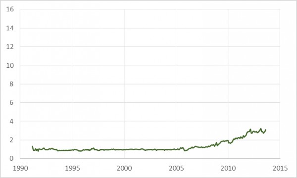 如下圖所示,以2013年美元的價(jià)值計(jì)算,1947年1月至2013年7月的真實(shí)油價(jià)水平:1947-1989年基于美聯(lián)儲經(jīng)濟(jì)數(shù)據(jù)的WTI油價(jià);1990-2013年基于美國能源信息署的布倫特油價(jià),利用CPI數(shù)據(jù)轉(zhuǎn)換成當(dāng)今的美元價(jià)值。