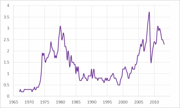 1967年一季度至2013年二季度,美國進(jìn)口汽油產(chǎn)品的美元價(jià)值占GDP的比重。數(shù)據(jù)來源于美聯(lián)儲